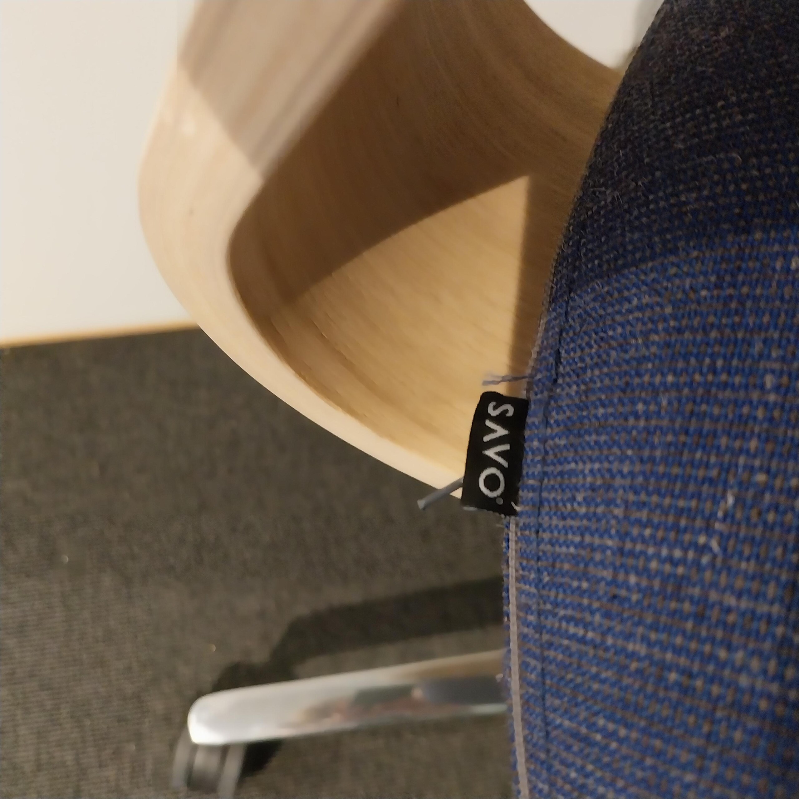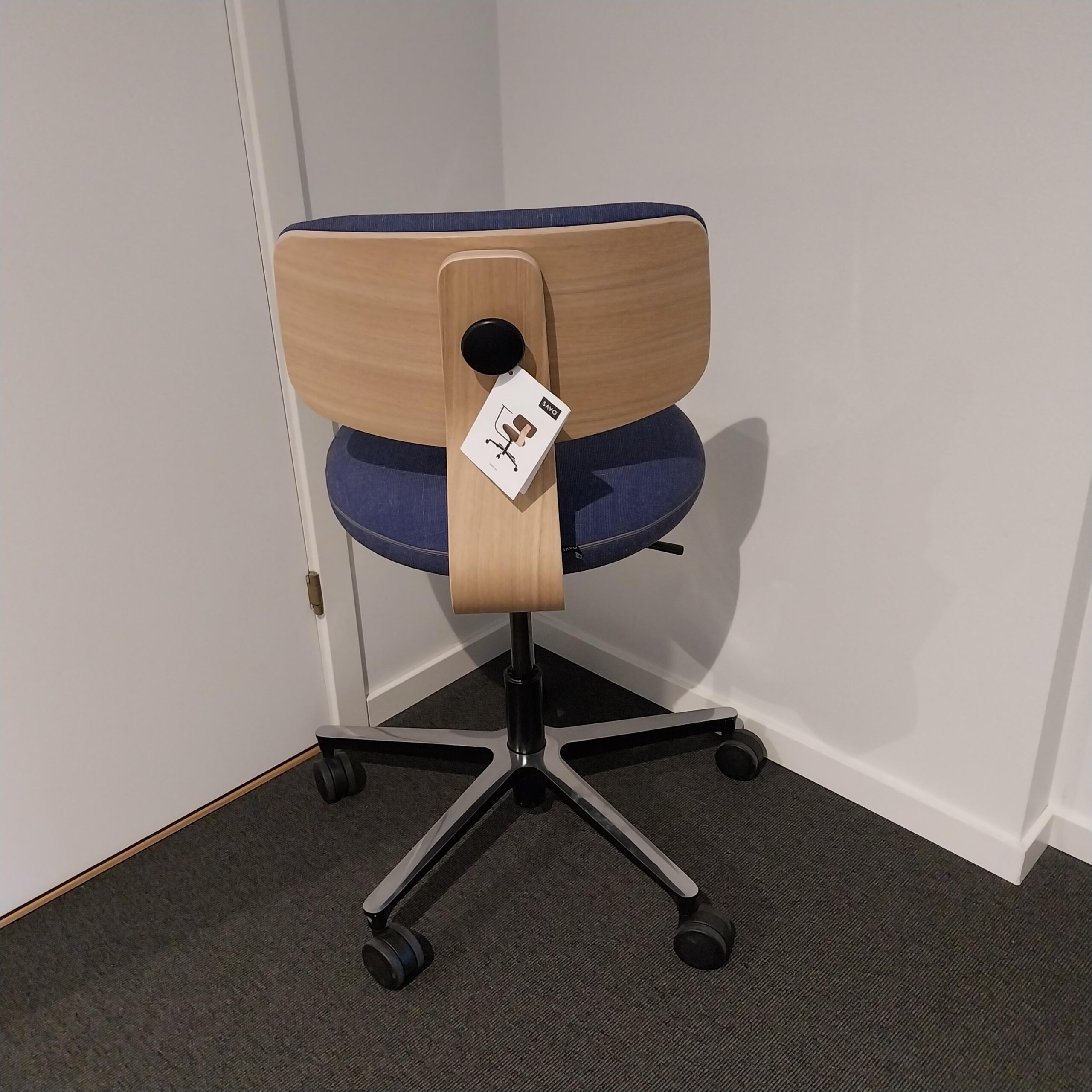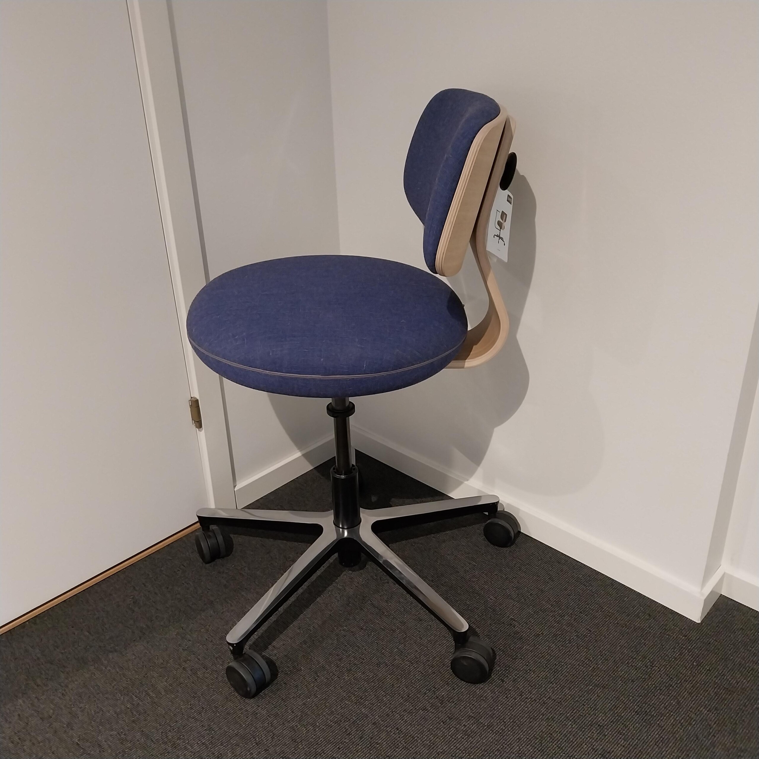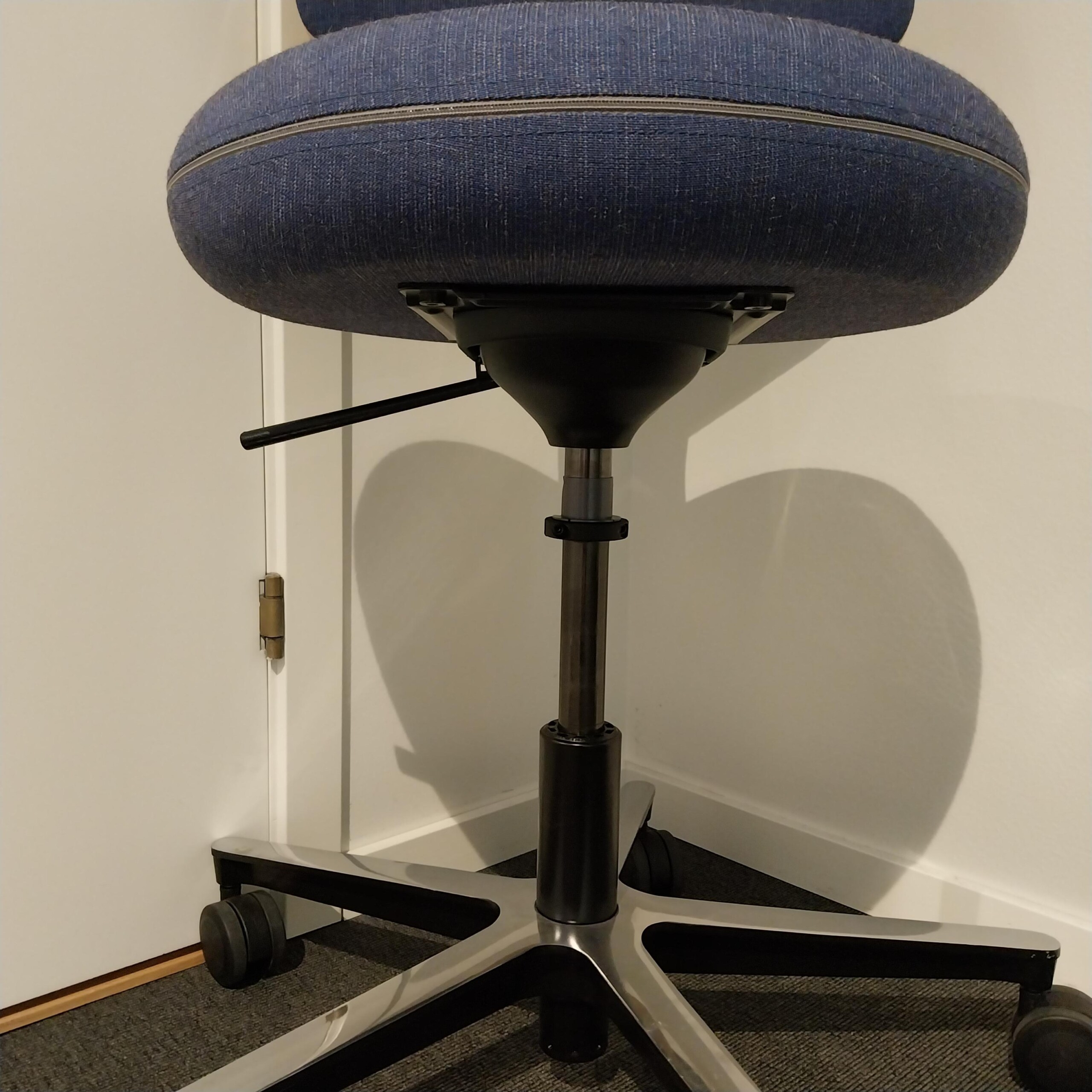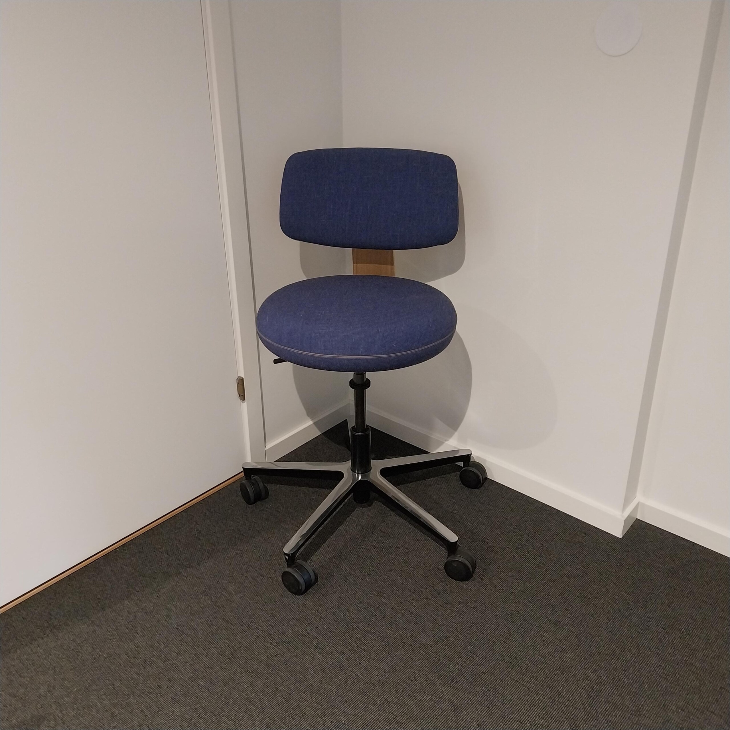 Seat and backrest in fabric (blue). Star base in metal (aluminium). Adjustable height.