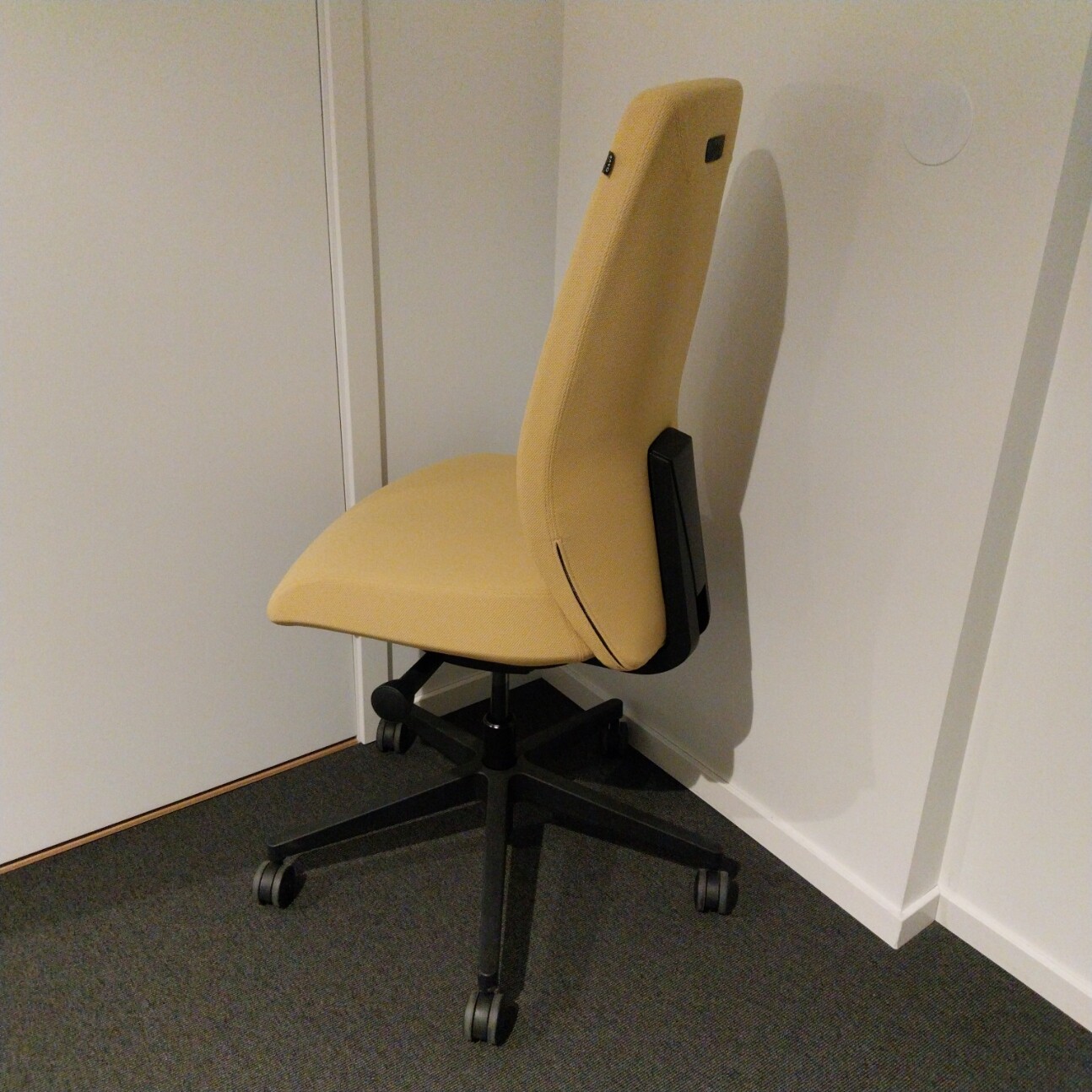Seat and backrest in fabric (yellow). Star base in plastic (black). Adjustable height.