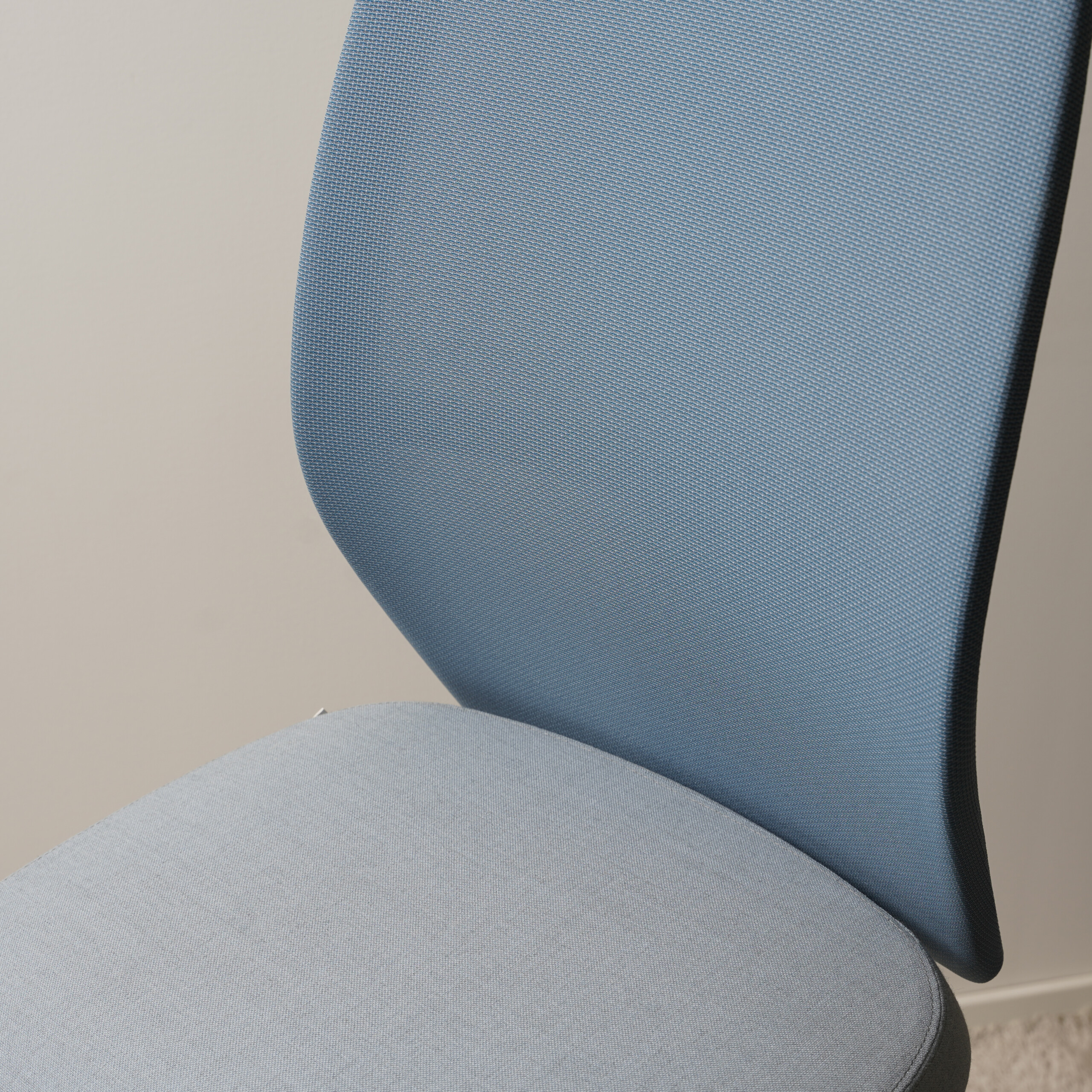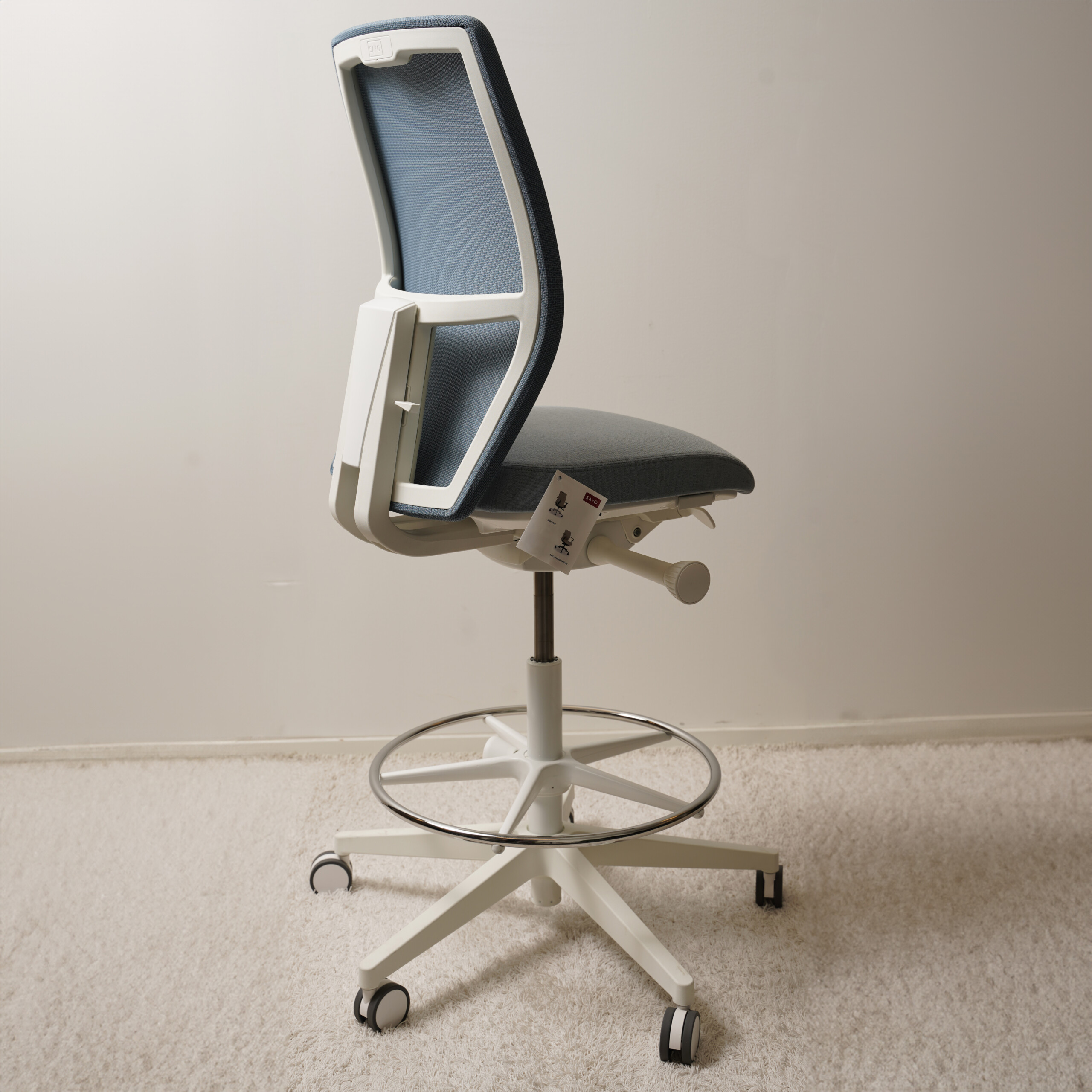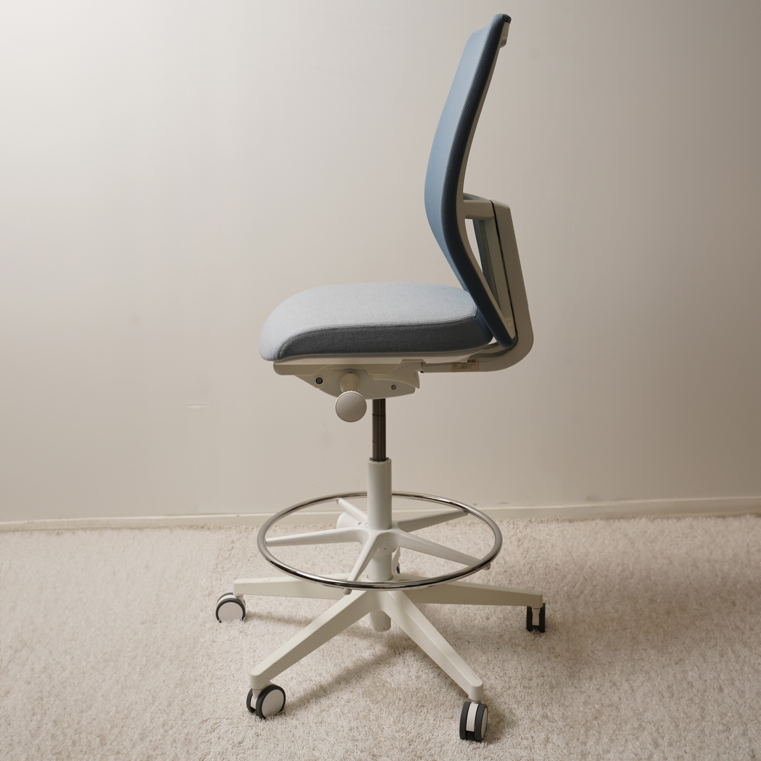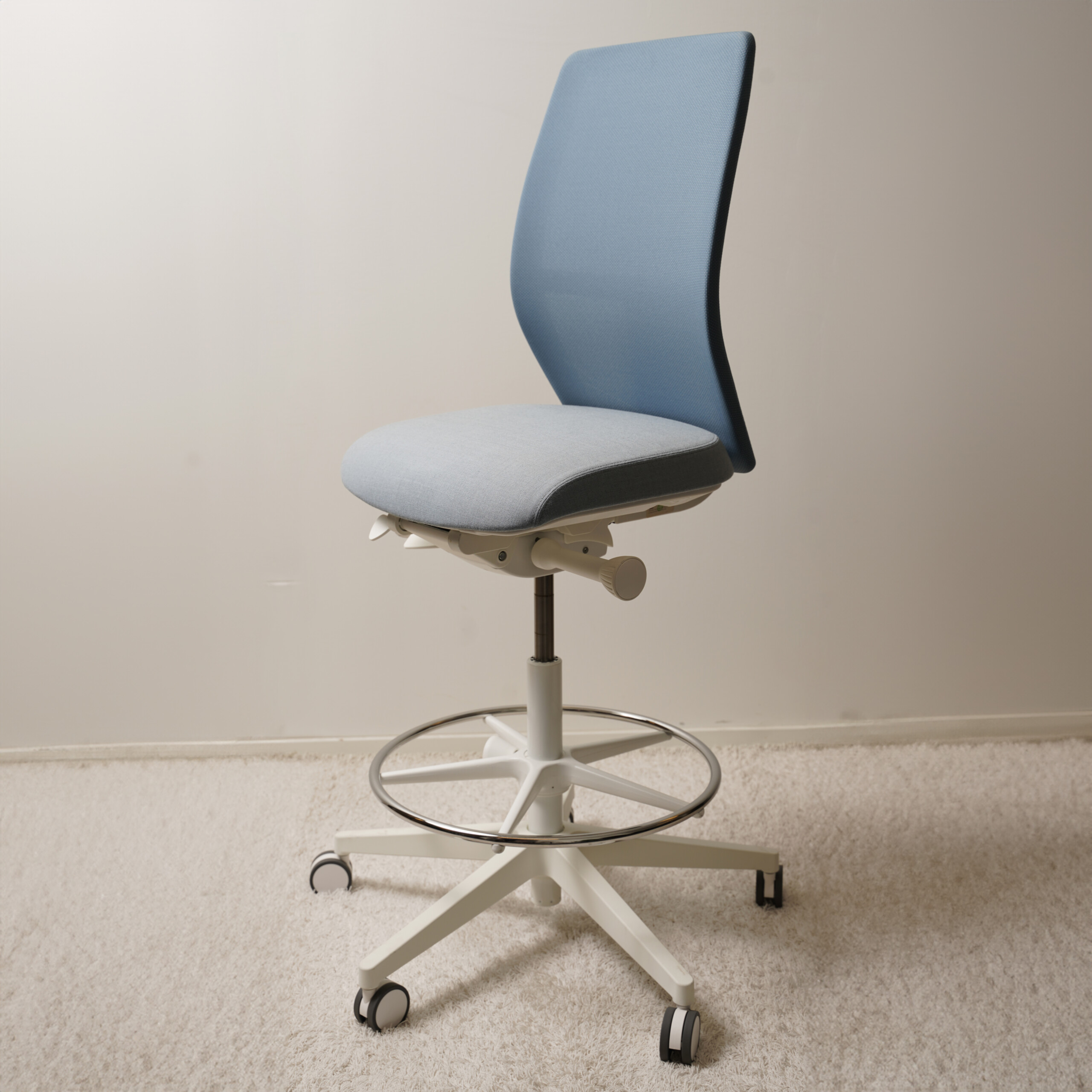 Seat in fabric (blue). Backrest in mesh (blue). Star base in metal (white). Adjustable height.