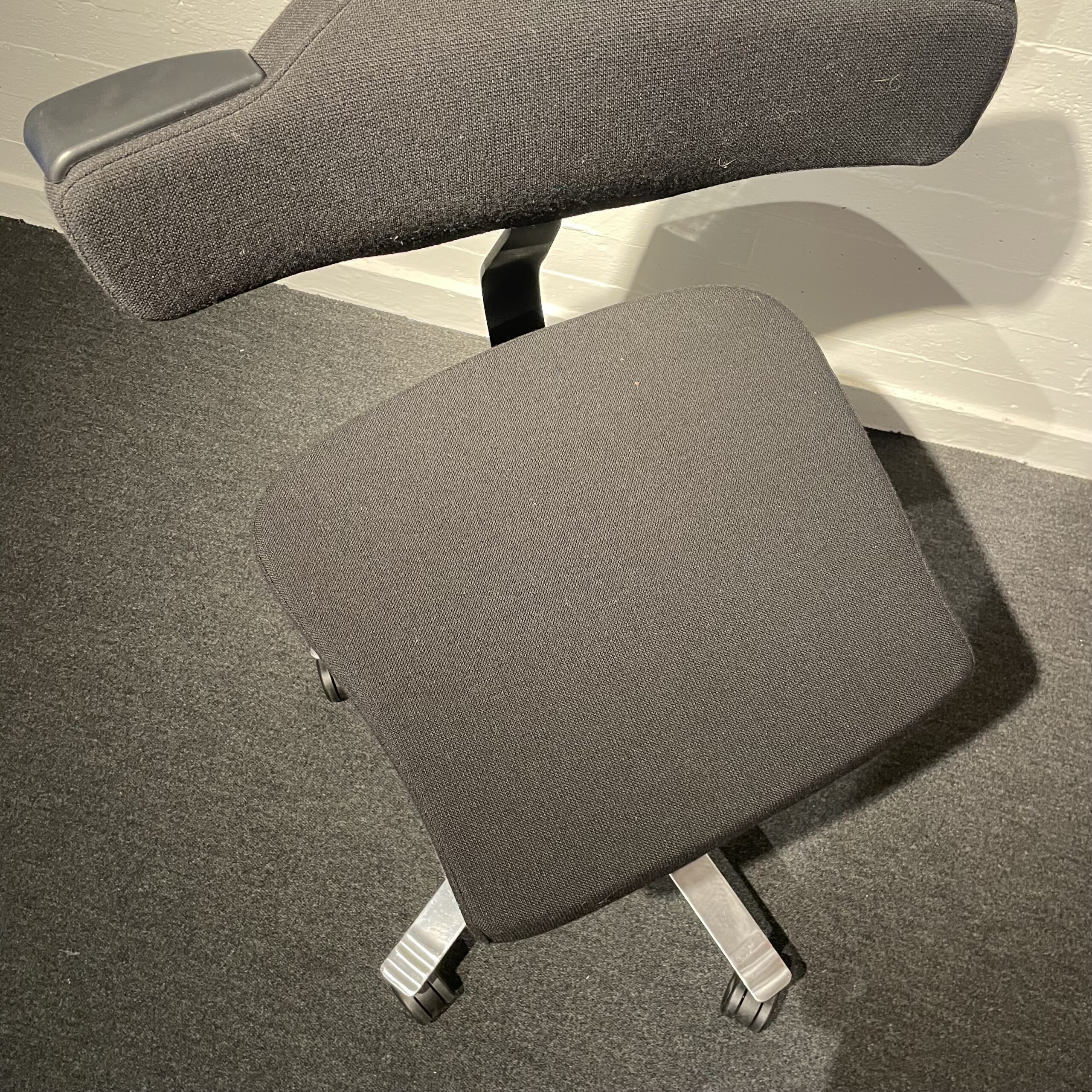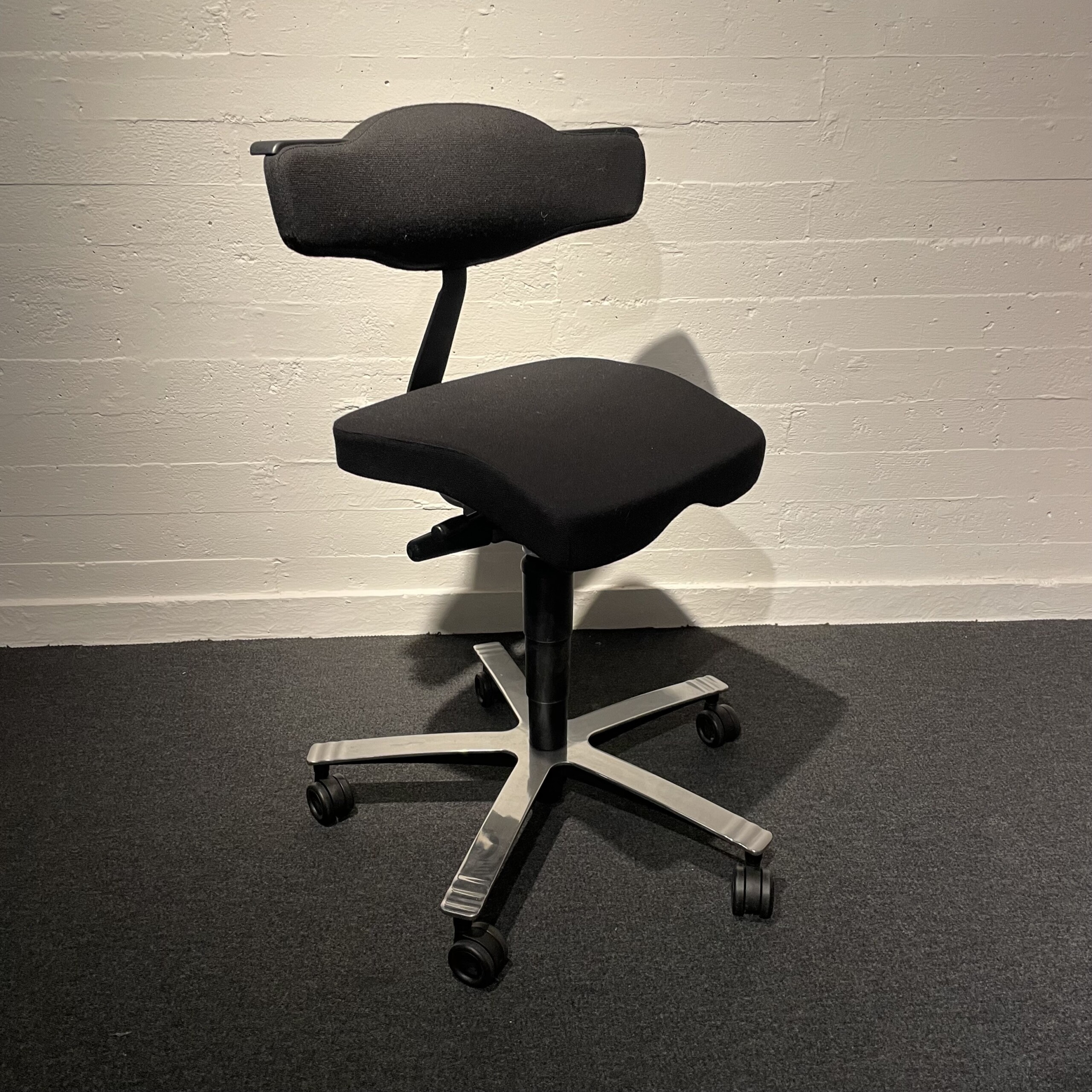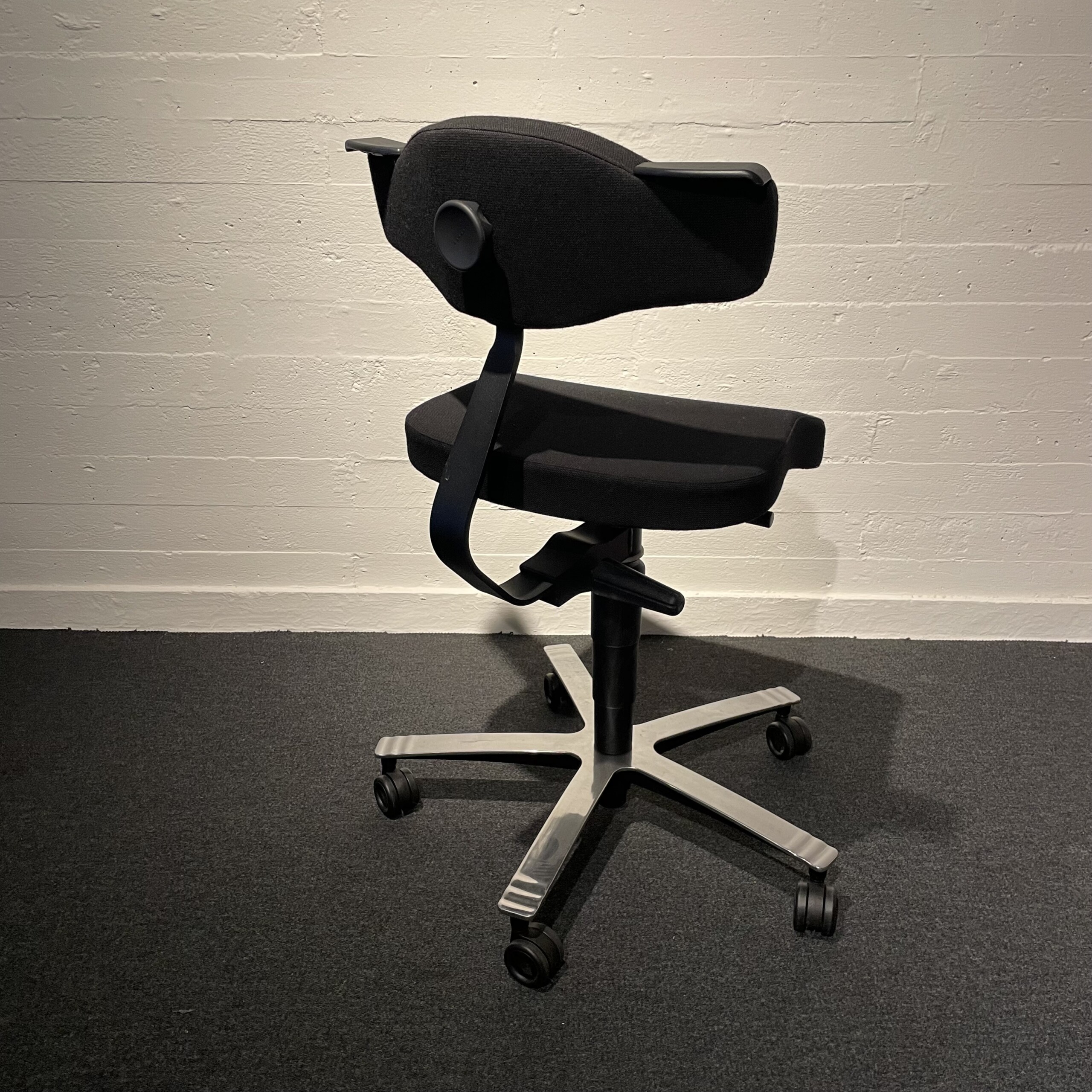 Seat and backrest in fabric (black). Star base in metal (chrome). Adjustable height.