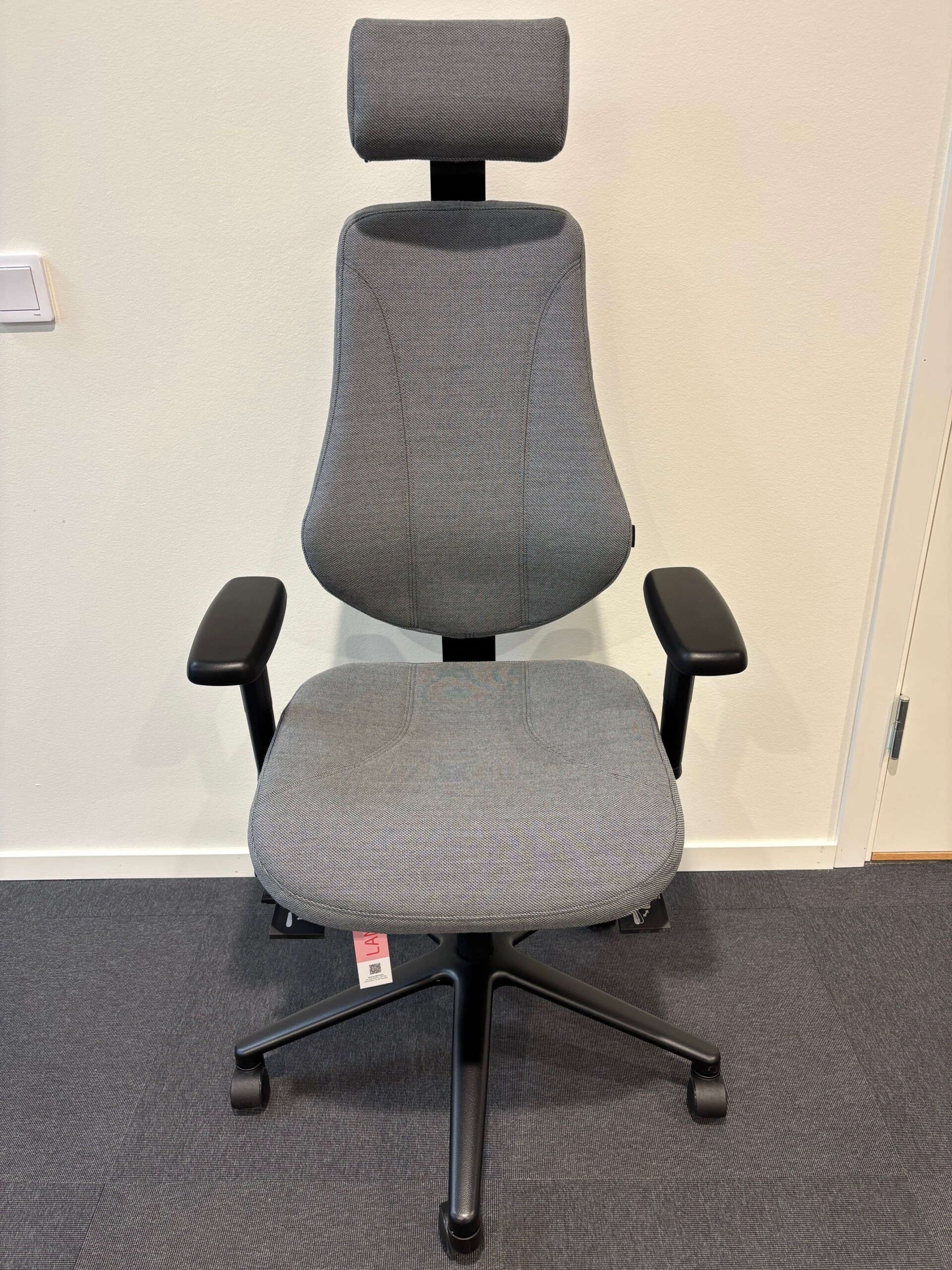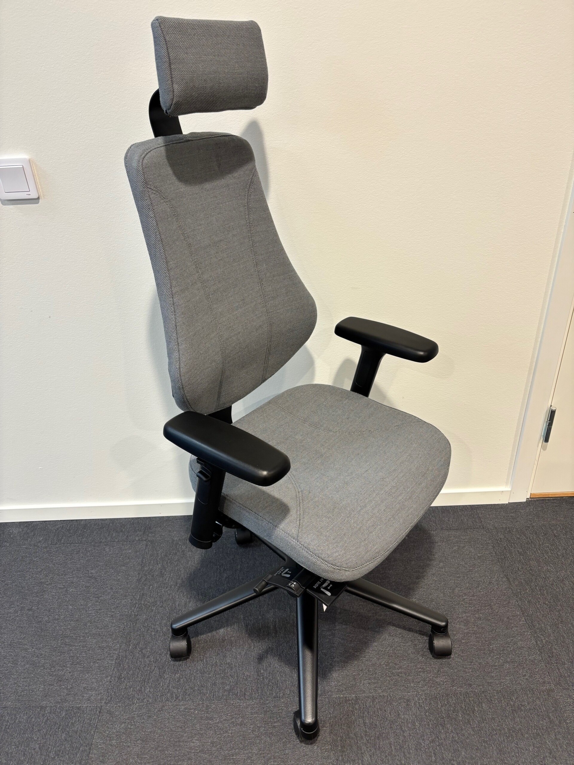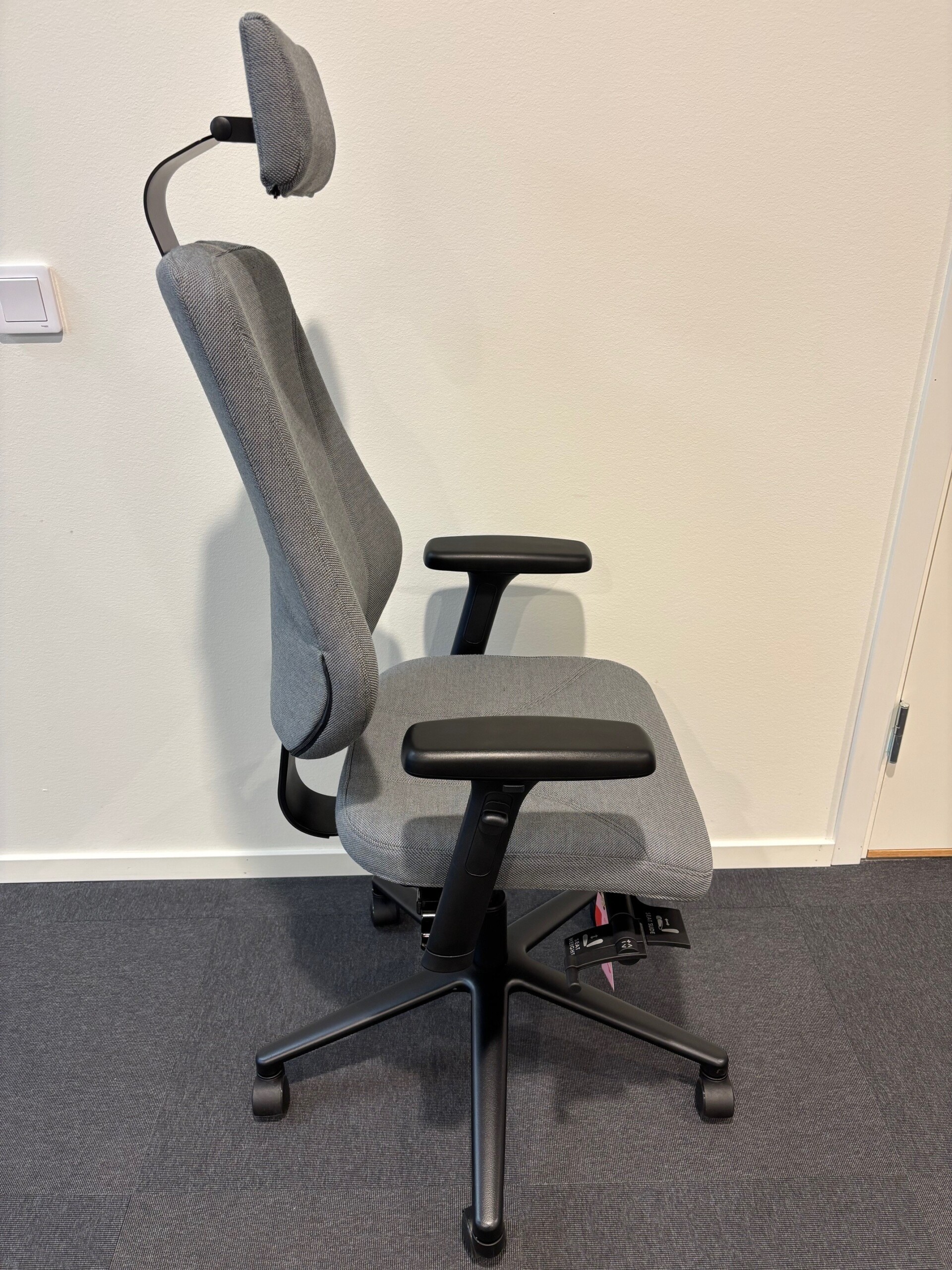 Seat and backrest in fabric (grey). Star base in metal (black). Adjustable height.